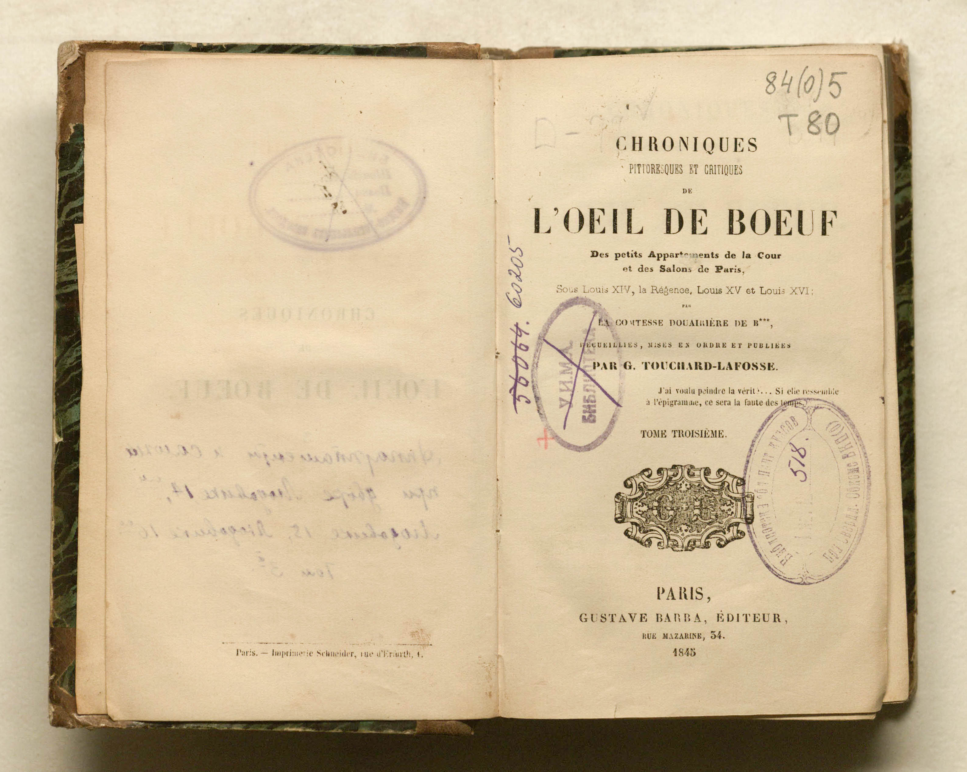Chroniques pittoresques et critiques de l'oeil-de-boeuf, des petits appartements de la Cour et des salons de Paris, sous Louis XIV, la Regence, Louis XV et Louis XVI, par la comtesse douairiere de B***, recueillies, mises en ordre et publiees par G. Touchard-Lafosse... 4 t. – T. 3. - Paris : G. Barba, 1845. - 545 p.; 11,5x18 cm.