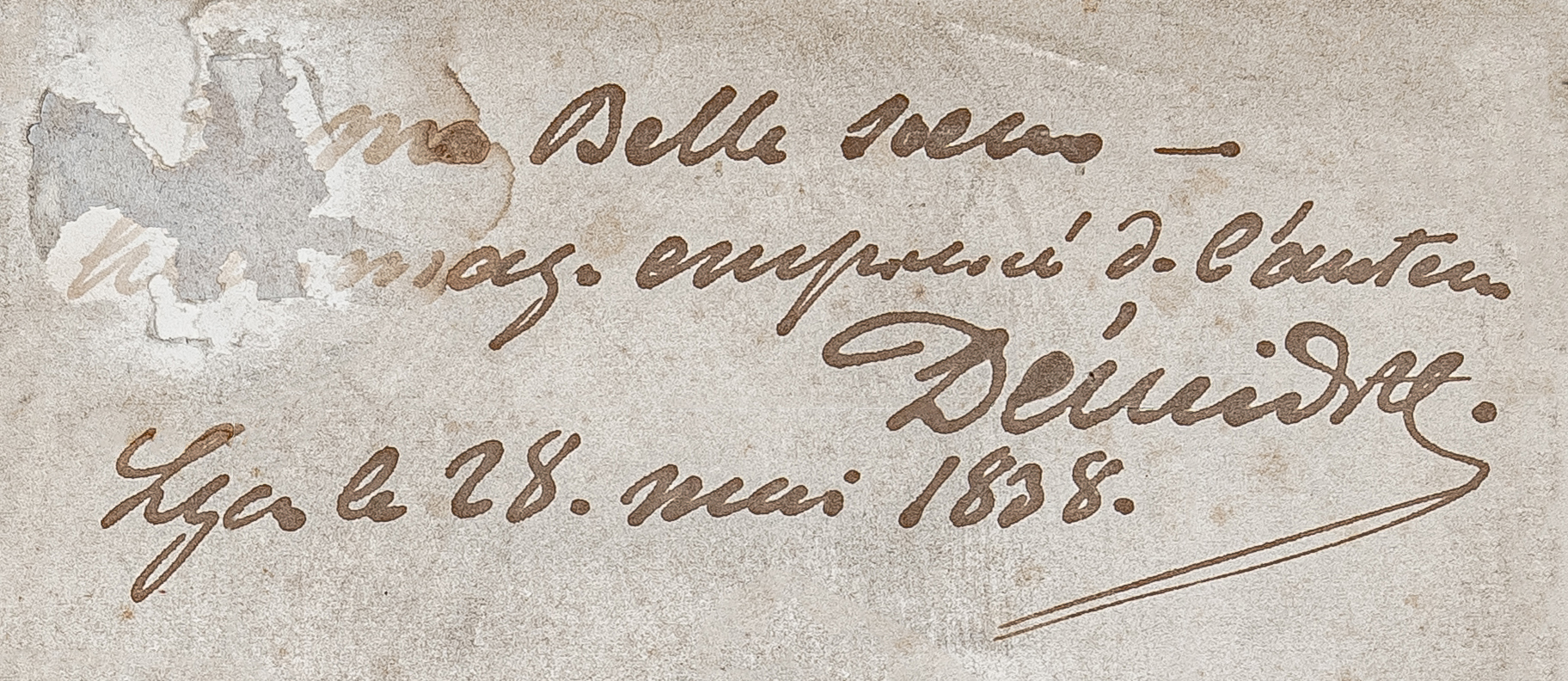 Дарственная надпись чернилами на французском языке: «A ma Belle soeur – hommage empressee de l’auteur. Demidoff. 28 mai 1838». Перевод: «Моей невестке – с почтением усердный автор. Демидов. 28 мая 1838». Надпись адресована жене П.Н. Демидова Авроре Карловне Шернваль – Демидовой. Анатолий Николаевич Демидов (1813-1870)