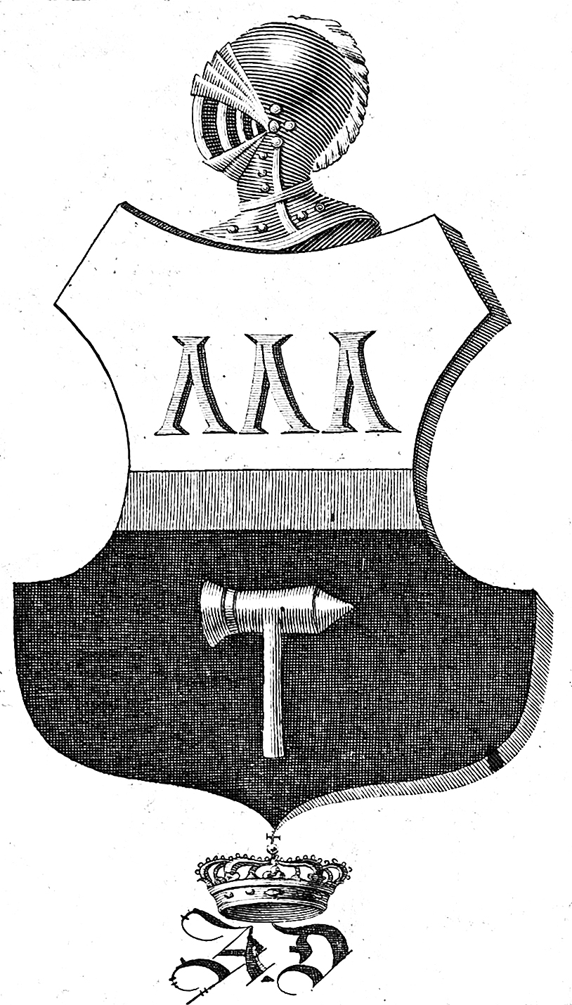Экслибрис геральдический, печать черная, гравюра, 26х24 мм. В двойной линейной рамке изображение герба рода Демидовых. По бокам инициалы владельца «P» и «D». Павел Григорьевич Демидов (1809-1859)