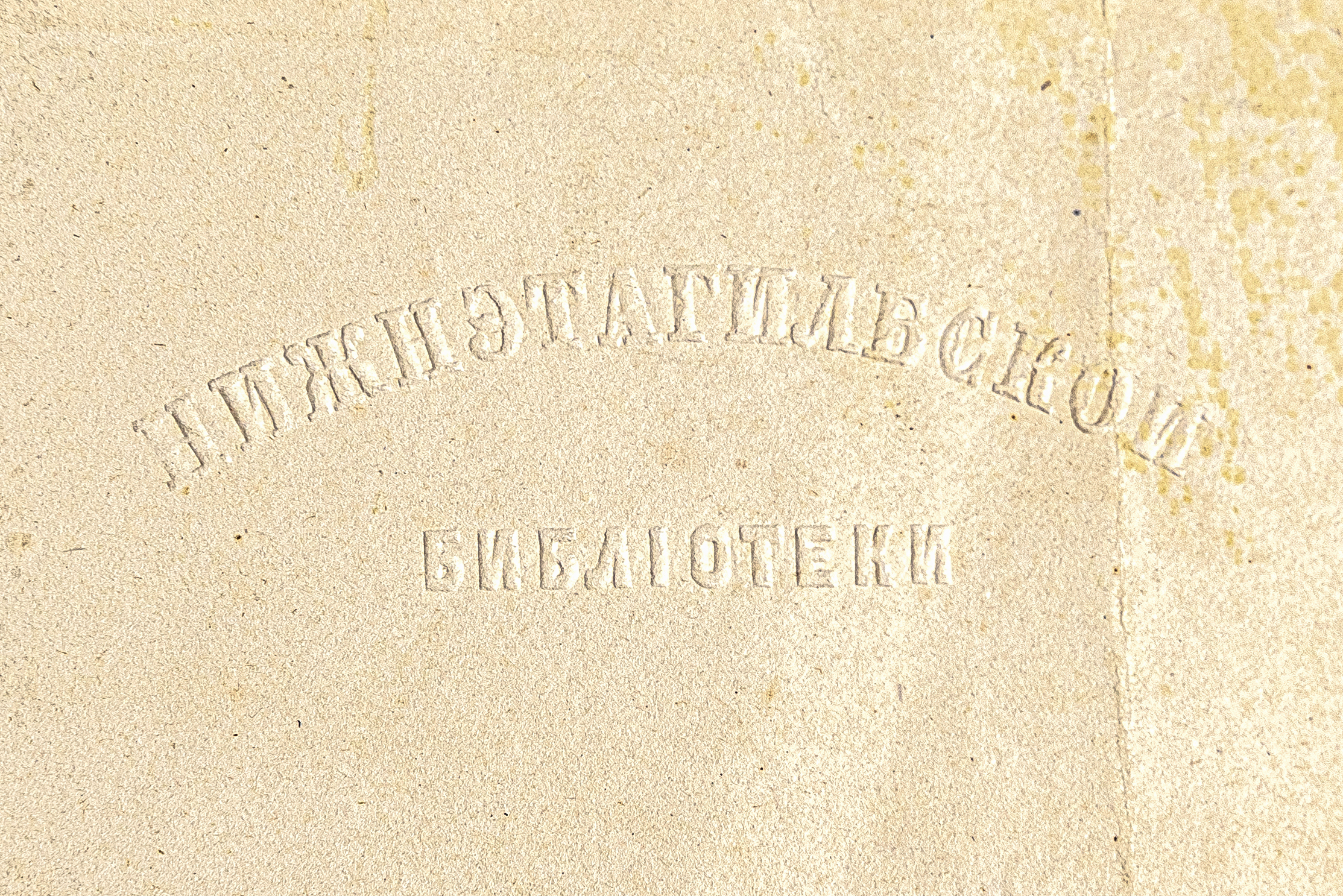 Конгревное тиснение, 15х47 мм. Надпись «Нижнэтагилбской библiотеки».