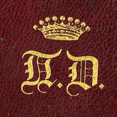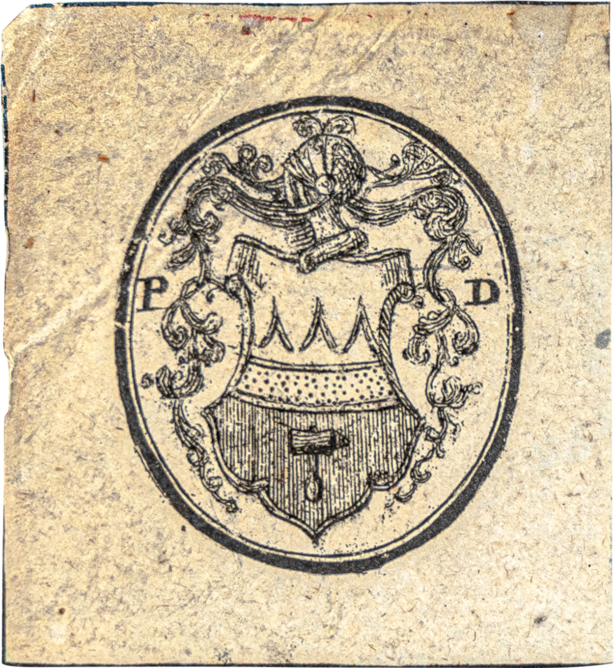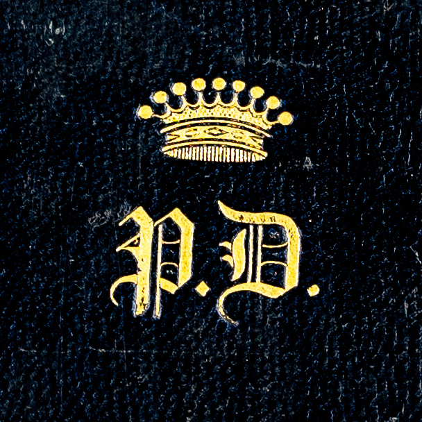 Суперэкслибрис, тиснение золотом, 25х25 мм. Изображение княжеской короны, под ней инициалы владельца «P.D.». Павел Николаевич Демидов (1796-1840)