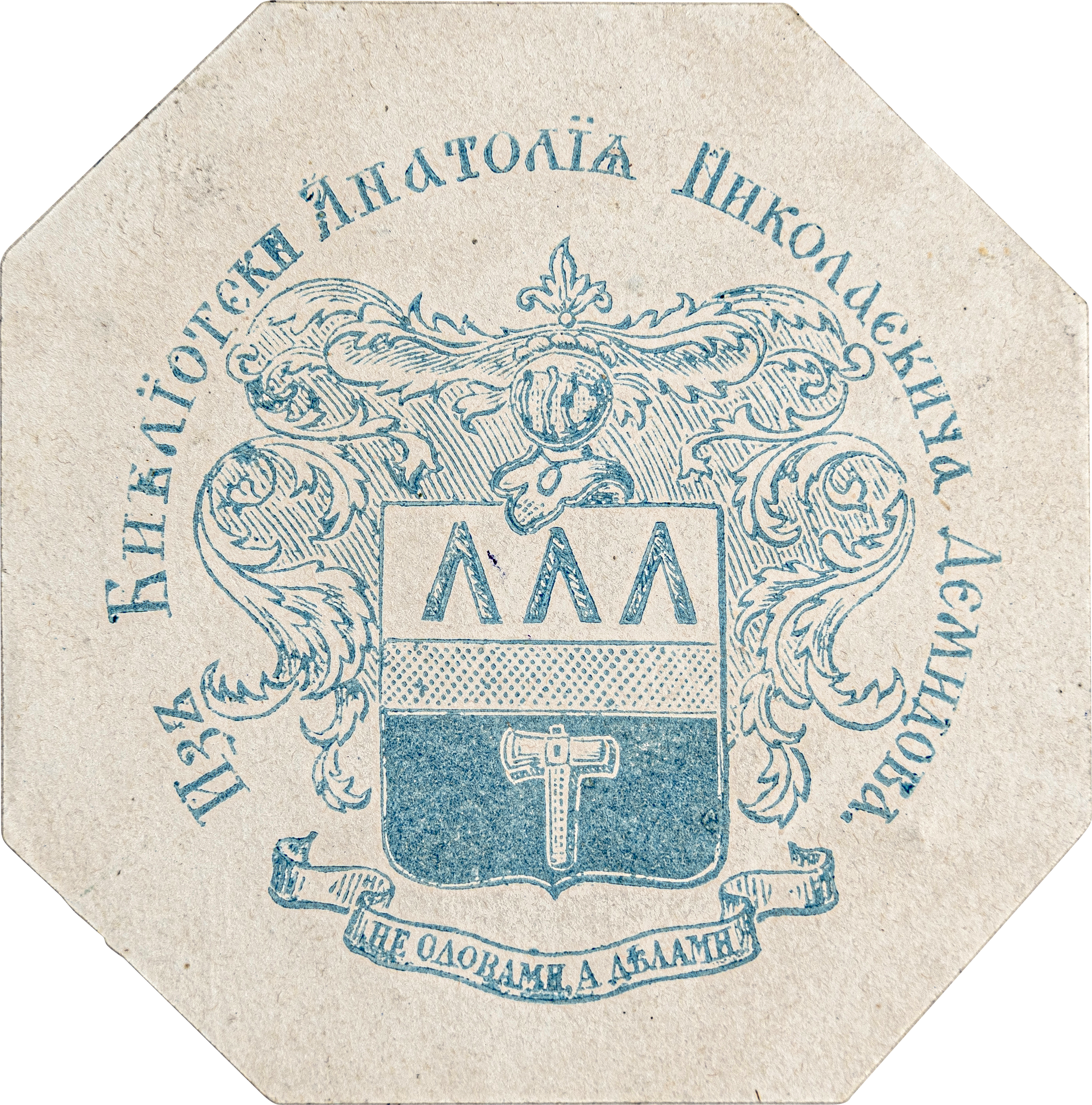 Экслибрис геральдический, печать голубая, литография, 49х49 мм. В центре изображение герба рода Демидовых. По верхнему краю надпись «Изъ Библiотеки Анатолiя Николаевича Демидова». По нижнему краю изображение ленты с девизом «Не словами, а делами». Анатолий Николаевич Демидов (1813-1870)