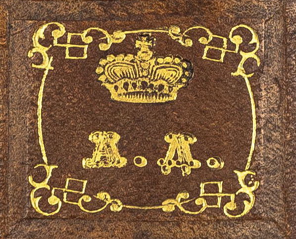Суперэкслибрис, тиснение золотом, 25х25 мм. Изображение княжеской короны, под ней инициалы владельца «А.Д.». Анатолий Николаевич Демидов (1813-1870)
