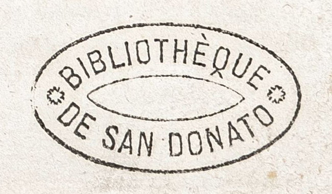 Штамп овальный, 21х39 мм. В линейной рамке надпись «Bibliotheque | de San Donato».